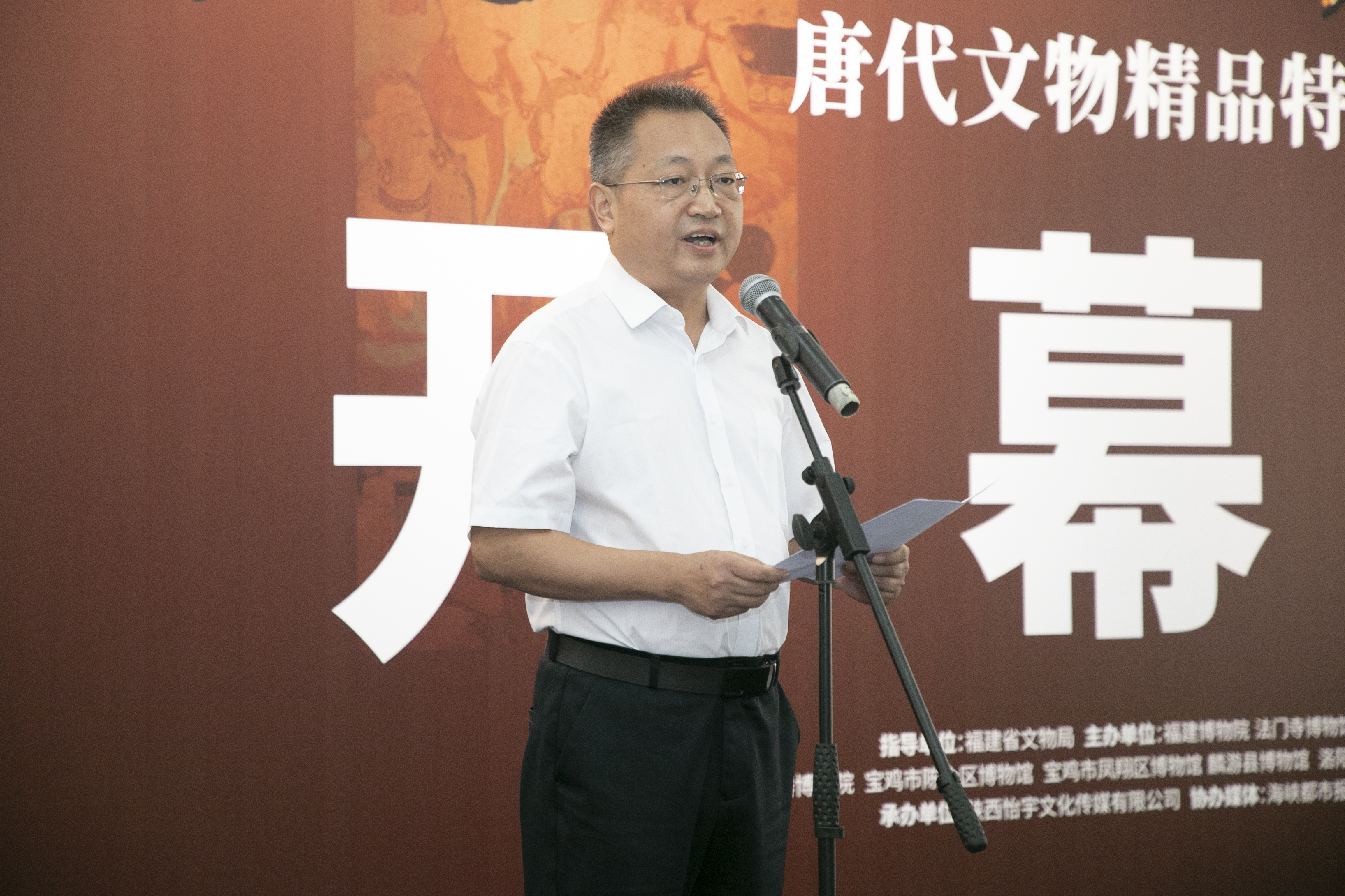 9月22日,“大唐盛世 法门珍宝——唐代文物精品特展”开幕式在福建博物院举行。福建省文化和旅游厅副厅长、省文物局局长、福建博物院院长傅柒生,宝鸡市文物局党组成员、副局长王明利分别致辞,开幕式由福建博物院副院长张焕新主持,展览主办、承办、协办单位领导参加开展仪式并共同触摸展览启动球揭幕。