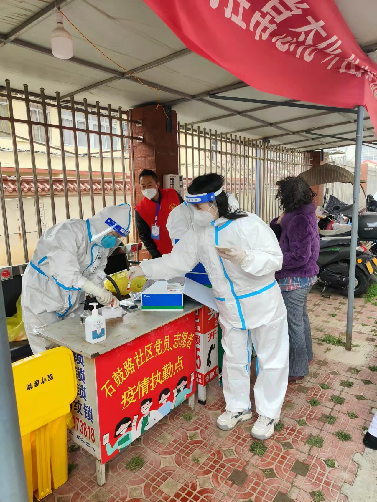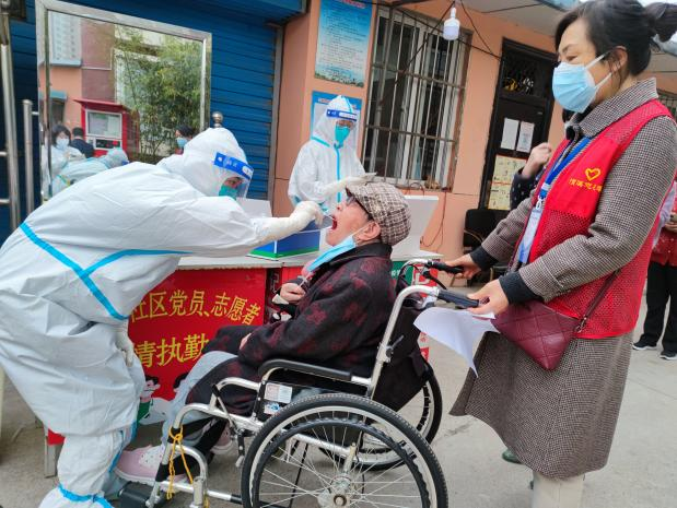 省军区干休所后高层是区博物馆值守的小区。从分配以来,每天早上六点前,区博物馆的志愿者就来到小区,做好核酸检测的准备工作,投入到紧张有序的疫情防控工作当中。在核酸检测的过程中,他们既是队伍秩序的维护者,又是那些不会使用手机的住户的帮助者。医护人员、社区工作者、志愿者、物业共同行动,让核酸检测的效率大大提高。多方协助,提高效率的同时,也减轻了大家的压力,让连续奋战的一线工作人员更有信心打赢这场疫情防控攻坚战。
