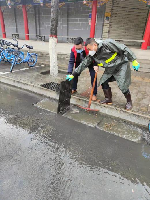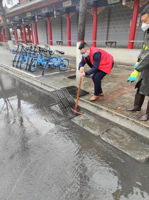 清理公园路(三馆门前)积水,确保疫情工作车辆顺利通行。