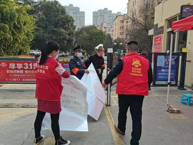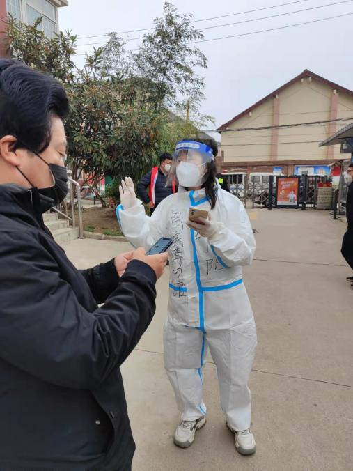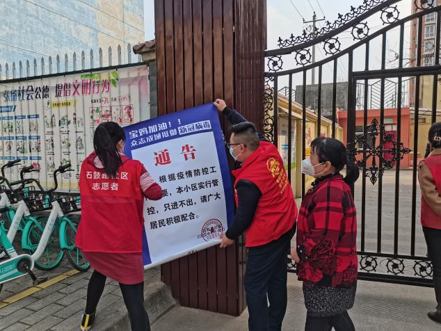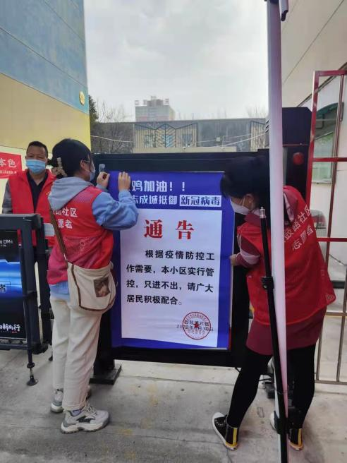 3月11日,王敬元、张阳协助石鼓路社区工作人员齐军莉来到百合花园小区、聚丰美伦小区等6个小区张贴“本小区实行管控,只进不出”的通告,贴完公告又即刻参与到了维持核酸检测队伍秩序的行动中来。