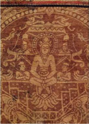 1983年青海省都兰县热水乡血渭吐番墓出土。北朝红地云珠日天锦为锦幡残片,整体为红地,上有云珠串成圆圈以兽纹或花纹图案环环相扣。圆环内中央或为交趾端坐的日天,或为人于坐骑之上持弓狩猎图。人物服饰带有明显的西域风格。除图案外,锦幡上原应织有文字,现残片上仅有“去”、“昌”等文样,现藏青海省文物考古研究所。
