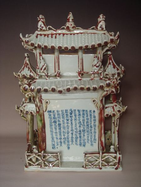 元青花釉里红瓷仓于1974年在江西省景德镇凌氏墓出土,通高29.5cm,横宽20.5cm。仓楼为亭式重檐,瓦由釉里红点彩串珠组成,飞檐、朱栋、雕栏,造型别致,华贵绚丽,充分体现了江南木构建筑的特色,现收藏于江西省博物院。