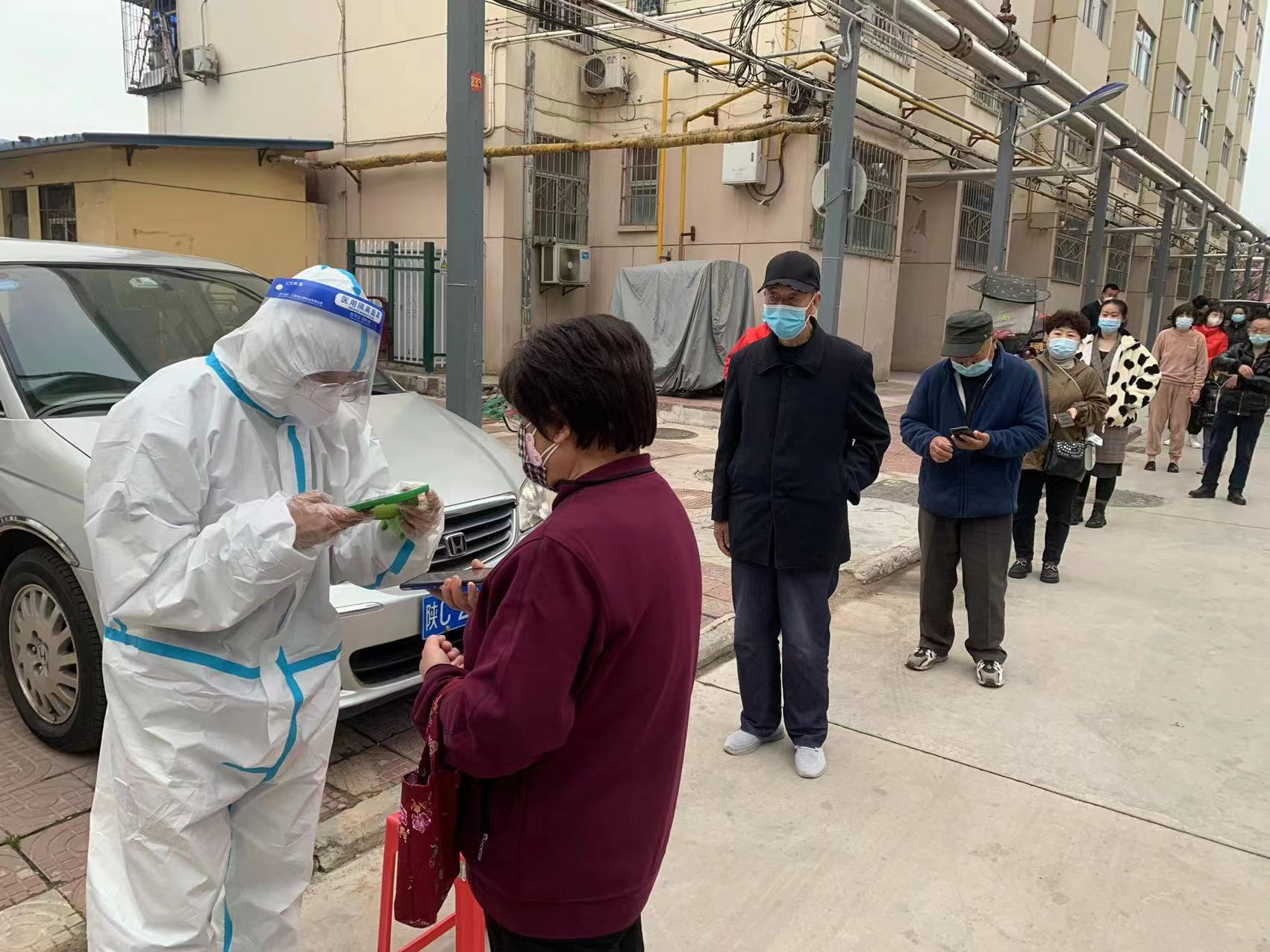 随之第一个考验接踵而来,由于各种原因,导致2点就从彬县驰援而来医疗小姐姐无法开展工作,从五点到七点,群众渐渐增长的队伍让我们感到巨大的压力。在不断地解释中,大多人表示理解,但仍有个别群众发起了情绪,但在我们耐心的解释和志愿者熟稔的人情中也渐渐平息下来。接下来扫码、疏散、检验,在我们默契的配合下一气呵成。