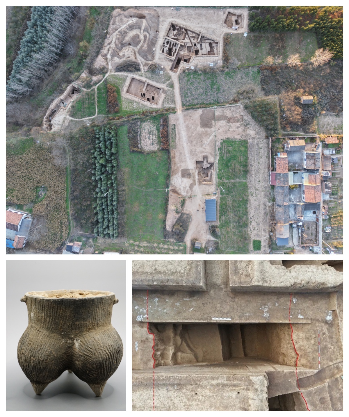 陕西省考古研究院、宝鸡市考古研究所组成发掘队伍,2024-2025年,对凤州古城、梁鹿坪遗址及周边区域开展考古调查,基本明确了古城的城垣结构及道路布局,新发现了古城内的窑址、桥梁及城南墓地。对梁鹿坪遗址东部区域进行重点勘探,勘探面积18,663.5平方米,共发现竖穴土坑、洞室墓102座,时代包括先周、战国、唐宋等,其中以战国墓为主。在遗址南部的安河北岸二级台地断崖处发现遗迹10处,其中M2、M3推测为先周墓葬,可能将故道开辟利用时代前推至商周之际,为研究早期的周道提供了有力支撑。在梁鹿坪遗址东部开展发掘工作,共发掘墓葬21座,发掘清理了包括新石器、商周及战国时期的各类遗存。
