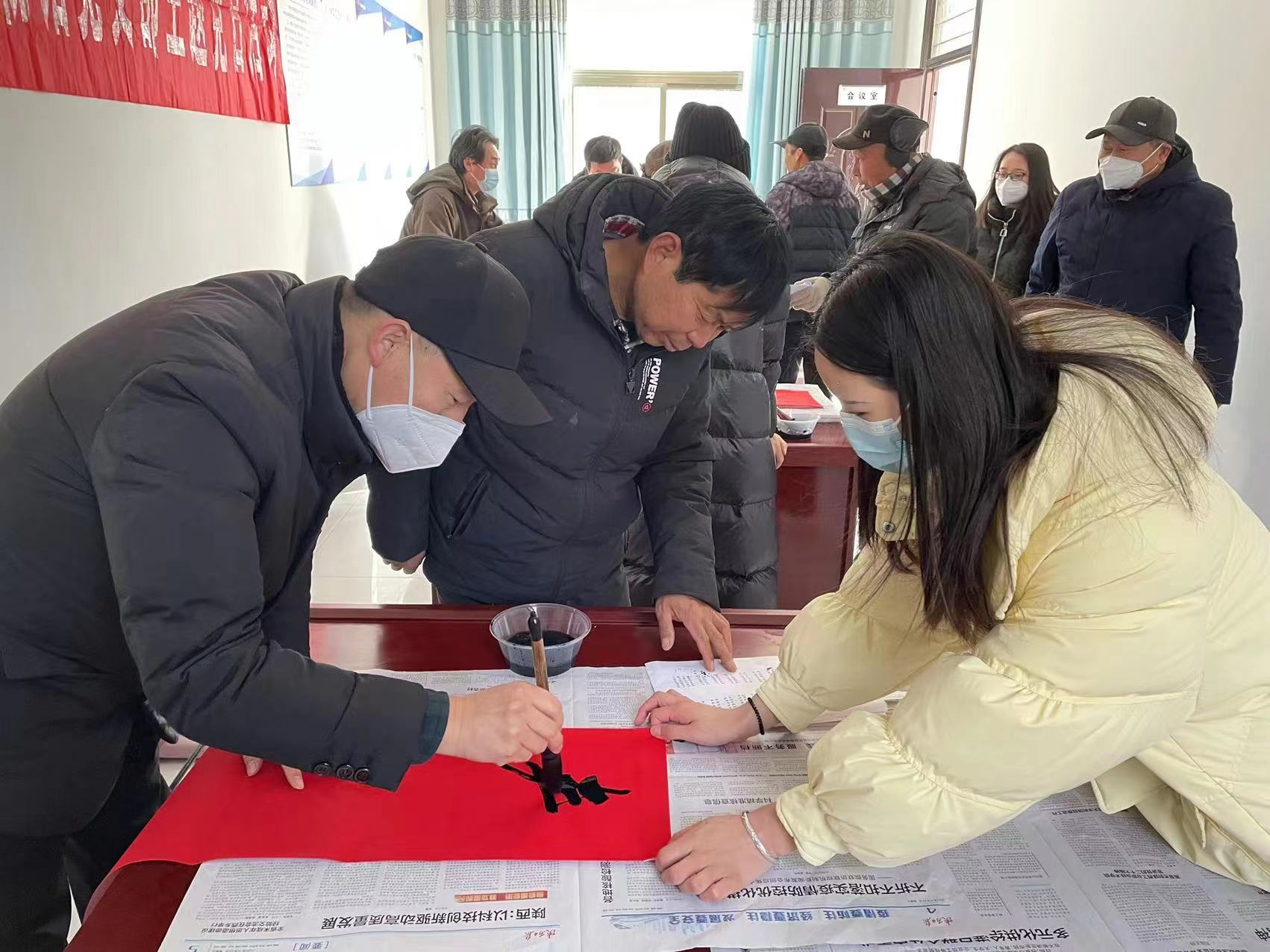 法门寺博物馆干部、中国书法家协会会员毛小东、宝鸡市书法家协会会员王竞香、韩恩平三名书法家,一边耐心倾听作里村村民要求,一边全神贯注地压纸、沾墨、起笔、收笔,一起一落之间,一幅幅用楷书、行书、隶书等挥就的大红春联完美呈现。活动现场气氛热烈,人头攒动,红纸翻飞,现场村民捧着手中红得耀眼的春联,如获珍宝,一个个脸上乐开了花。