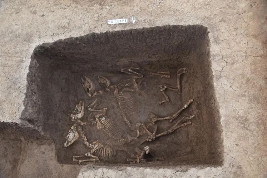 下站遗址位于宝鸡市高新区磻溪镇下站村,是一处春秋至西汉晚期的祭祀遗址,总面积约23万平米,共发现各类祭祀坑1400余座。经国家文物局批准,2020年、2022年、2023年,由中国国家博物馆、陕西省考古研究院、宝鸡市考古研究所、陈仓区博物馆组成考古队,对下站遗址进行了考古发掘,清理祭祀坑、房址、灰坑等各类遗迹,出土大量马、牛、羊祭祀用牺牲,玉器、铁器、青铜车马器,以及砖、瓦、瓦当等遗物。